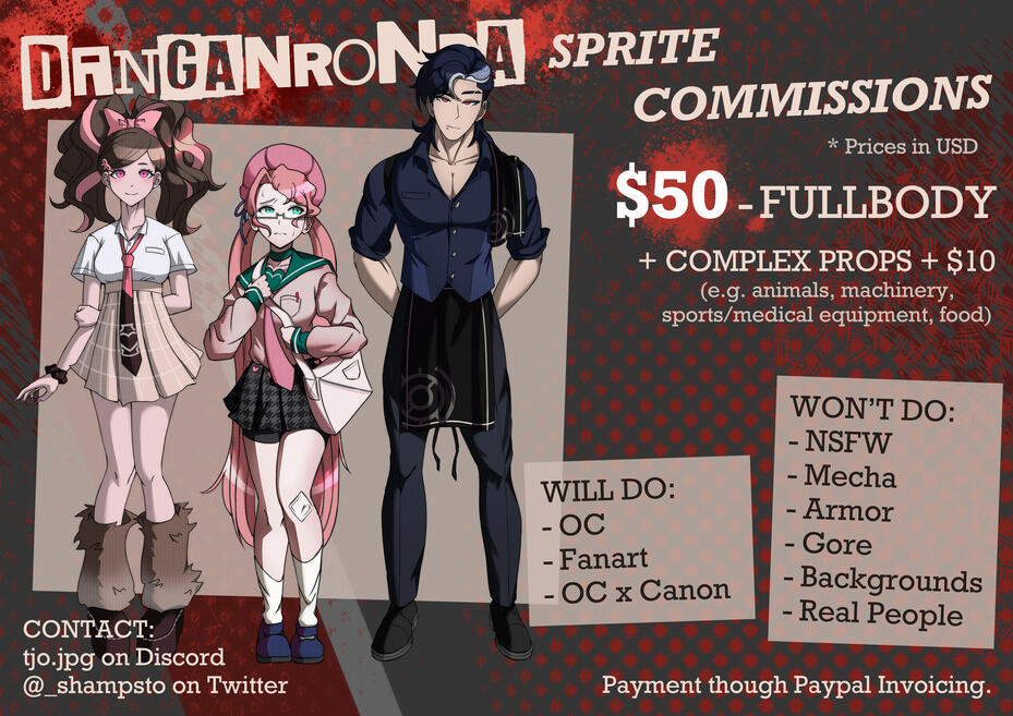 *All info is subject to change.ORDER PROCESSMessage me through either of the following with your enquiry:- @_shampsto on twitter- tjo.jpg on discordBOUNDARIESWon't draw- NSFW